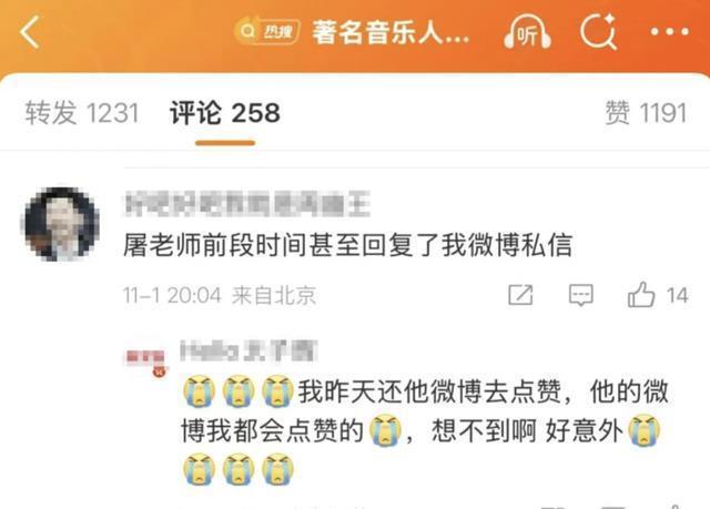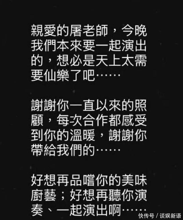 晚间,吴青峰发文称:“亲爱的屠老师,今晚我们本来要一起演出的,想必是天上太需要仙乐了吧……谢谢你一直以来的照顾,每次合作都感受到你的温暖,谢谢你带给我们的……好想再品尝你的美味厨艺;好想再听你演奏、一起演出啊……”