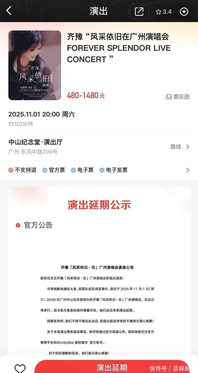 11月1日下午3时,星统寰宇文化发展(北京)有限公司(下称“星统寰宇”)官方社交平台发布紧急公告:因团队成员突发意外,原定于2025年11月1日20点在广州中山纪念堂举办的齐豫「风采依旧·在」广州演唱会延期。观众可根据个人安排是否保留门票或退票,公司将尽快给出交通住宿相关赔偿方案。 广州中山纪念堂票务管家微信公众号之后也发文称,原定于2025年11月1日在广州中山纪念堂举行的齐豫 广州演唱会 因团队成员突发意外,无法正常举行。