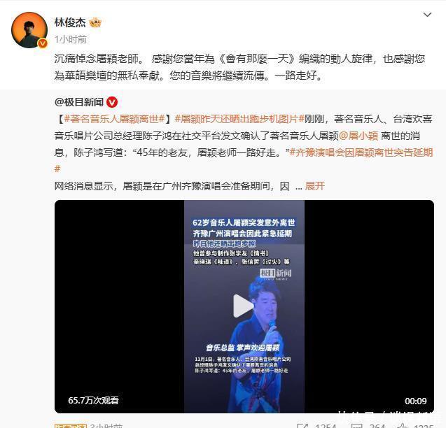 11月1日晚,林俊杰、杨丞琳、吴青峰等在社交平台先后发文,悼念这位著名的音乐人。 林俊杰在微博感谢屠颖当年为自己的《会有那么一天》编织动人旋律,“也感谢您为华语乐坛的无私奉献。您的音乐将永久流传。一路走好。”