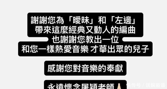 杨丞琳则在社交媒体感恩屠颖曾为自己的《暧昧》《左边》两首经典歌曲“带来这么经典又动人的编曲”,“感谢您对音乐的奉献,永远怀念屠颖老师。”