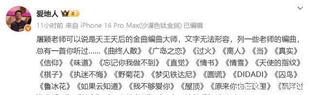 歌手之外,乐评人也纷纷表达对屠颖离世的不舍与震惊。著名乐评人耳帝特别在微博分享了齐豫的《不要告别&告别》,乐评人爱地人在微博分享了屠颖编曲的一长串歌单,以此纪念这位著名音乐人为华语乐坛做出的贡献。